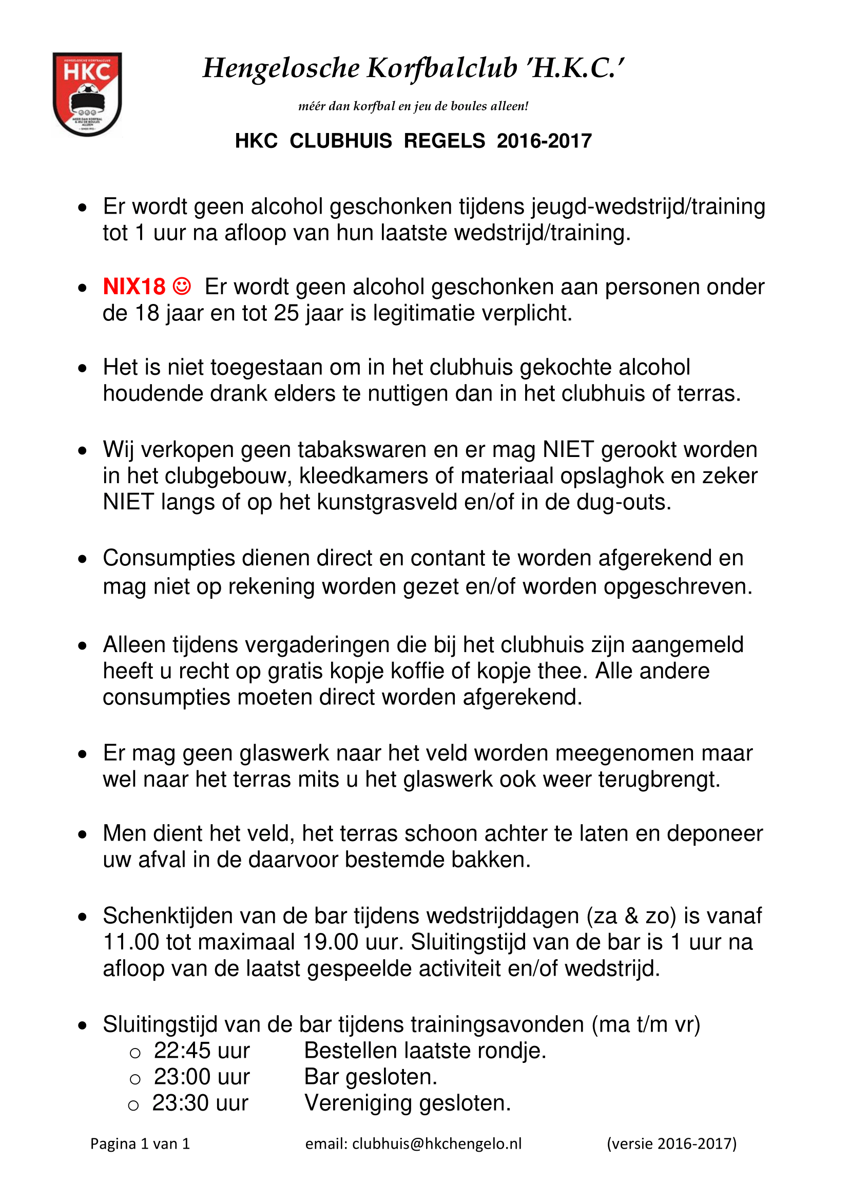 Het clubhuis kan dit seizoen besproken worden bij Marjolein Steenberg via e-mailadres: clubhuis@hkchengelo.nl